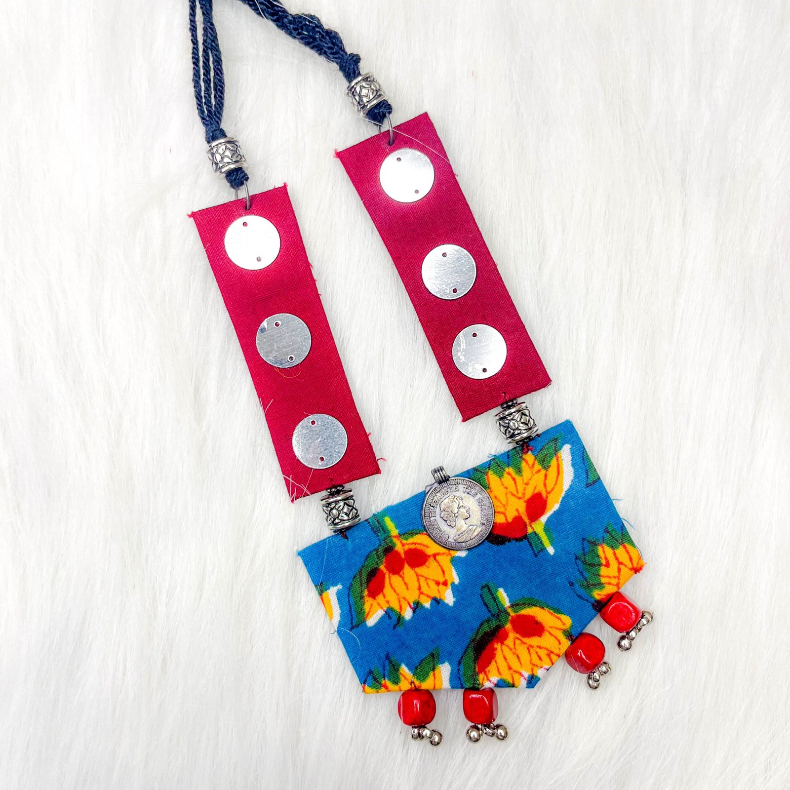 Add a touch of ethnic charm to your look with this handmade floral necklace set. Featuring a vibrant floral print on fabric, accented with mirror work and delicate bead detailing, this set is perfect for boho, festive look. The lightweight necklace with matching earrings ensures comfort while making a bold piece.