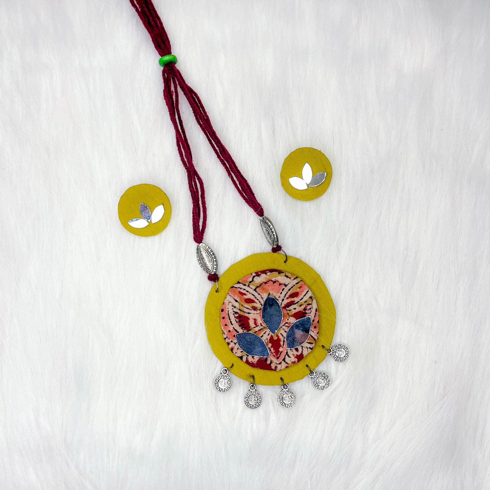 Elevate your style with this stunning accessory set featuring a sleek rectangular design adorned with bold red stripes against a pristine white fabric. The intricate silver dangling accents bring a bold ascent, while playful pom-poms add a vibrant pop of color. Paired with red strings embellished with bold silver beads, this set is complemented by matching mini rectangular earrings that showcase silver cowrie shells and delicate dangling beads. Perfect for making a bold fashion statement while ensuring a touch of elegance in every ensemble.