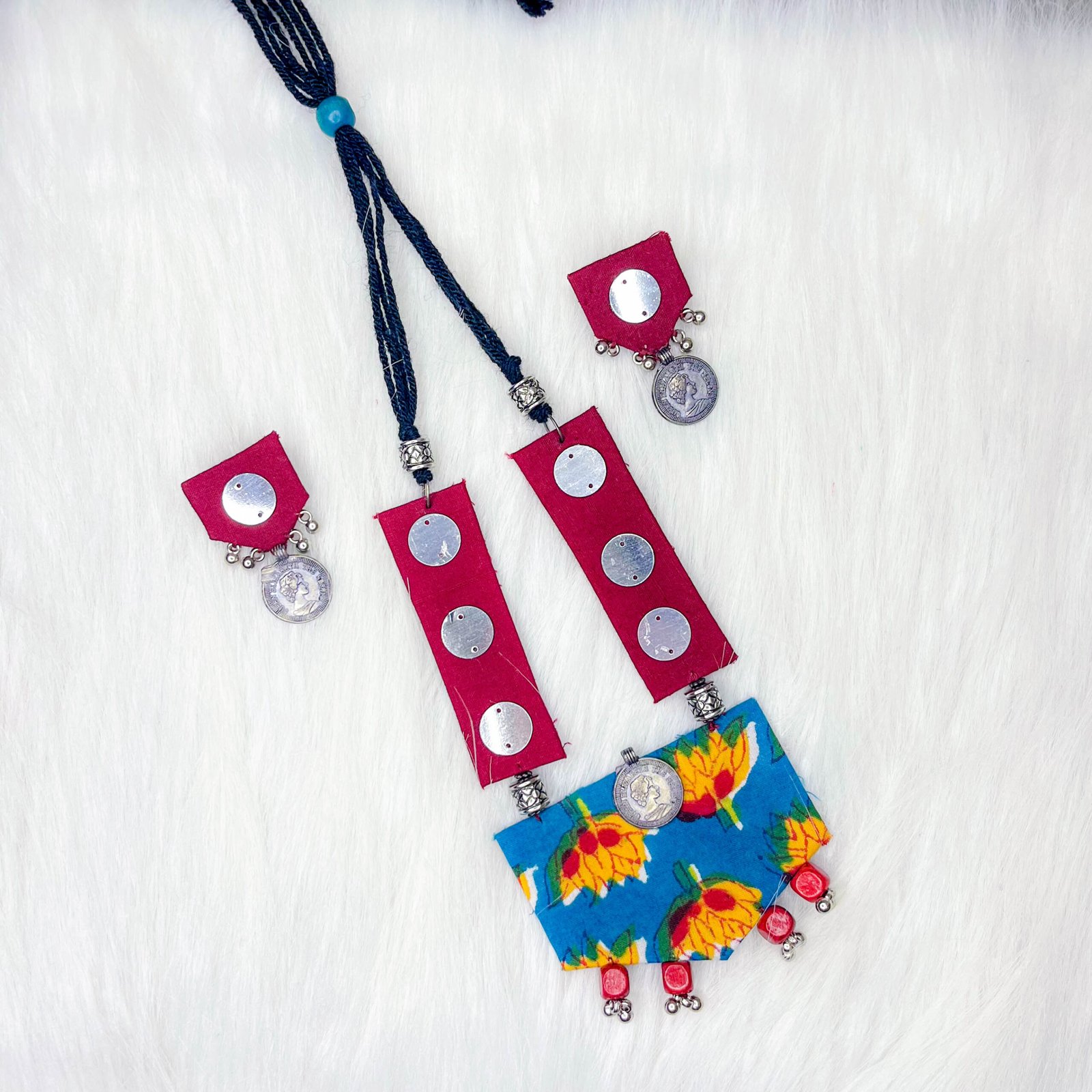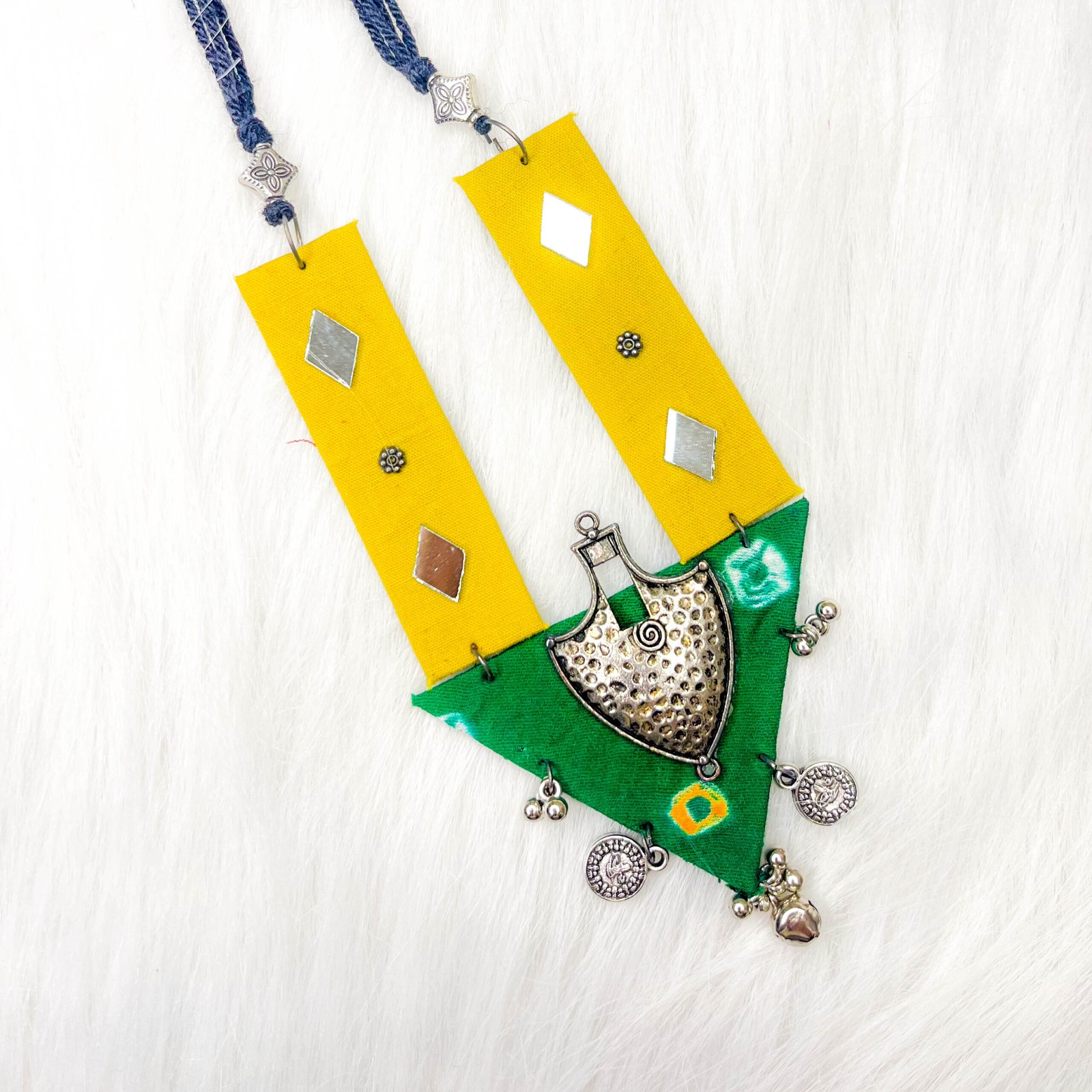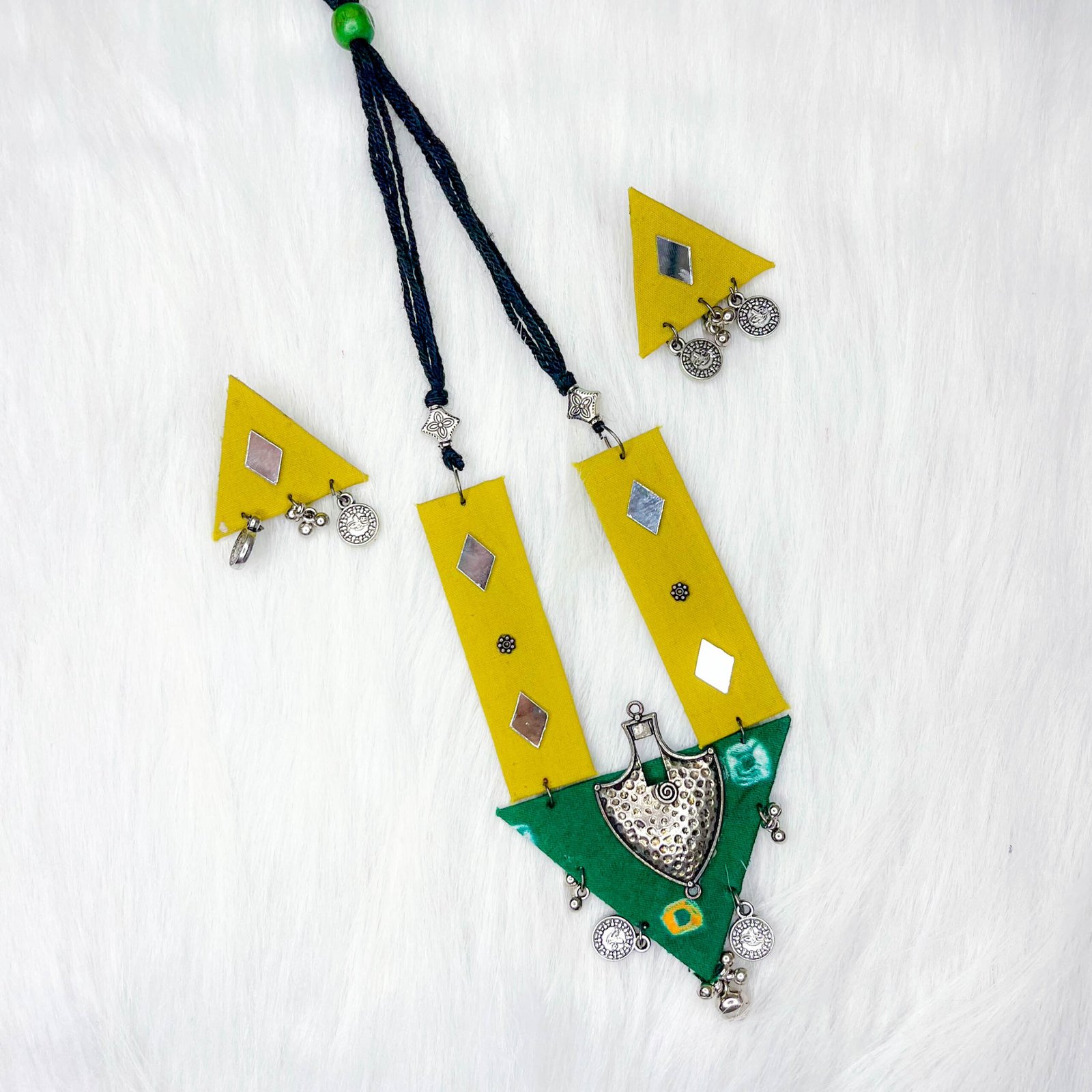 This exquisite set features a stunning combination of vibrant bandhani fabric and plain fabric, elegantly adorned with silver accents at the center. The handcrafted mirror work adds a ethnic touch, while the delicate dangling gungroo on the edges creates a graceful movement. Accompanied by matching triangle-shaped earrings, embellished with mirror work and dangling gungroo, this ensemble is perfect for special occasions, celebrating the beauty of tradition with a modern twist.