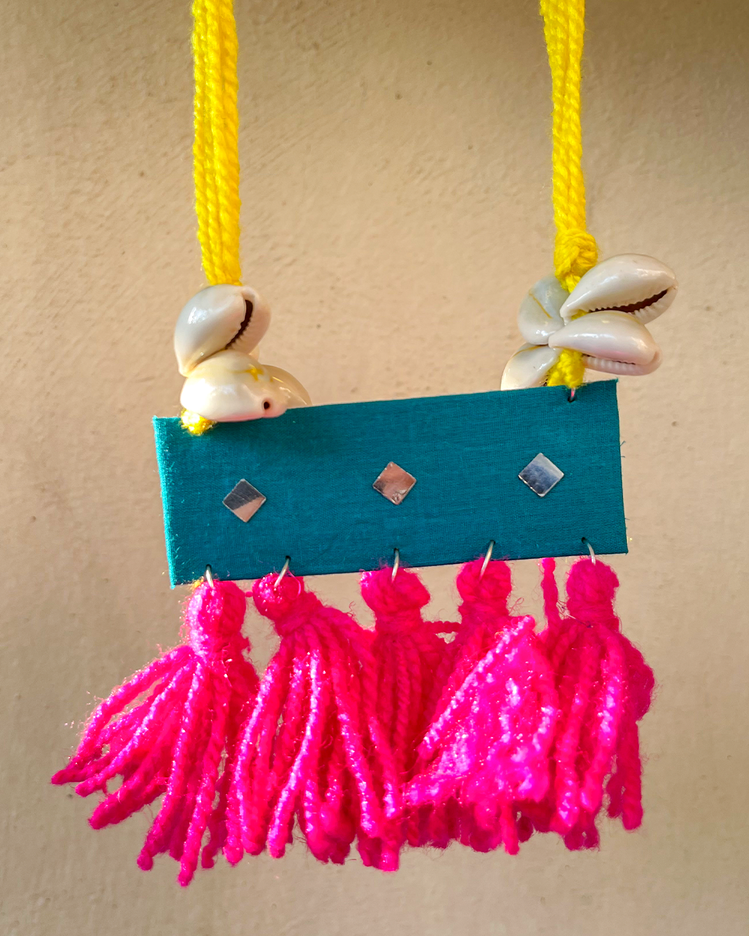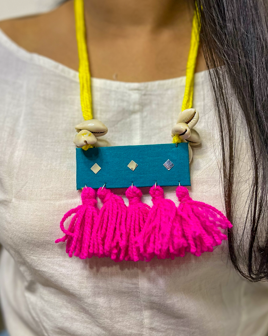 Add a pop of colour to your outfit with this vibrant Cowrie Tassel Necklace! The handcrafted design features striking pink tassels that contrast beautifully with the teal base, while delicate cowrie shells add a touch of beachy charm. Perfect for boho-chic styling or as a standout accessory, this necklace is a versatile and playful addition to any wardrobe. Its lightweight feel and unique aesthetic make it the ideal go-to piece for festivals, casual outings, or summer vibes.