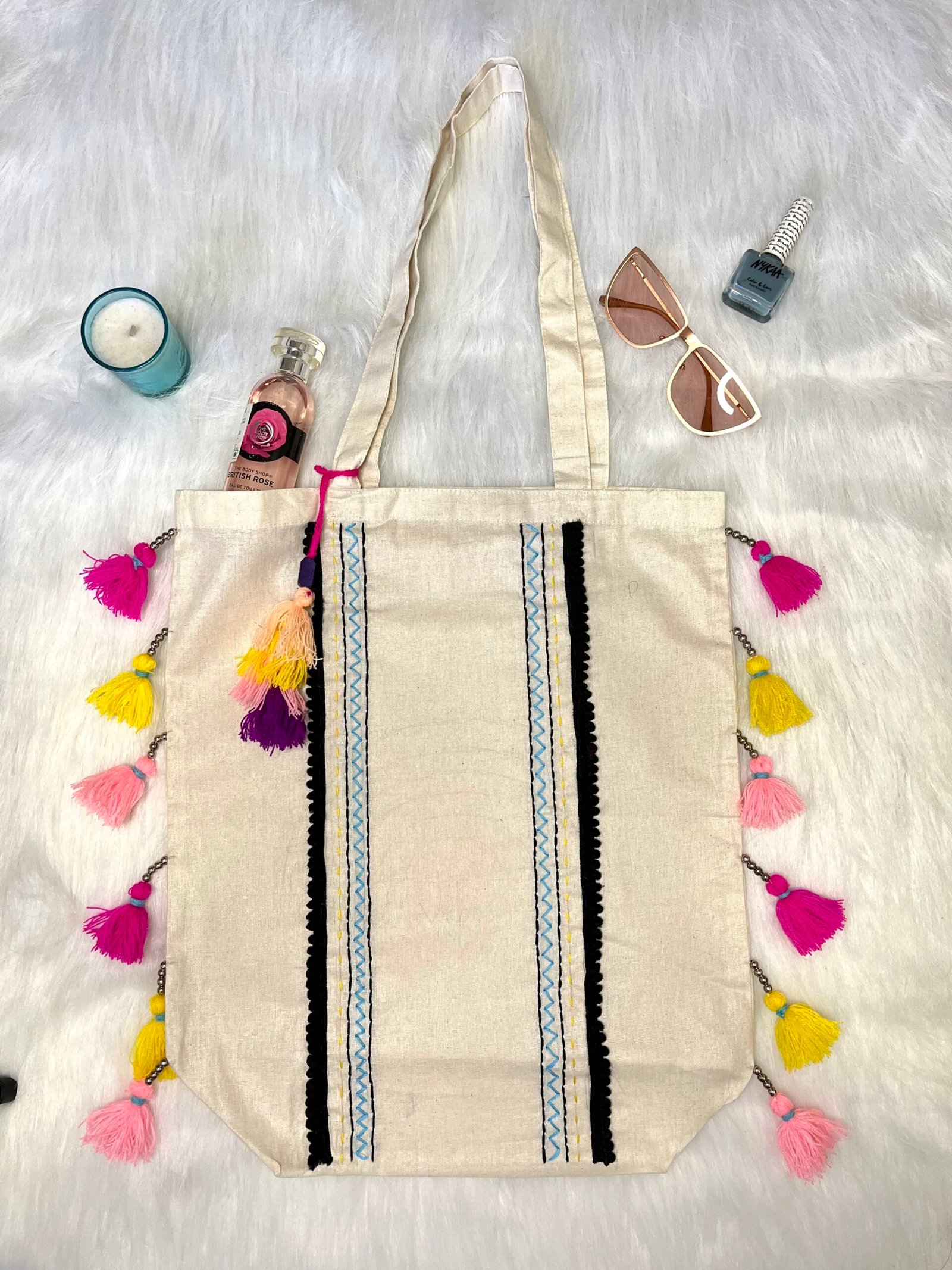 Our handmade canvas tote bag is the perfect blend of traditional craftsmanship and modern style. Seamlessly handcrafted with love, this tote features a stunning mix of vibrant tassels and intricate hand embroidery. Ideal for pairing with both ethnic and casual outfits, it effortlessly adds a touch of ethnic charm to your look. Whether you’re heading out for a casual day or a special occasion, this tote is your go-to accessory to make a fashionable statement. With its unique design and practical use, this bag is sure to elevate any outfit while showcasing the beauty of handcrafted artistry.