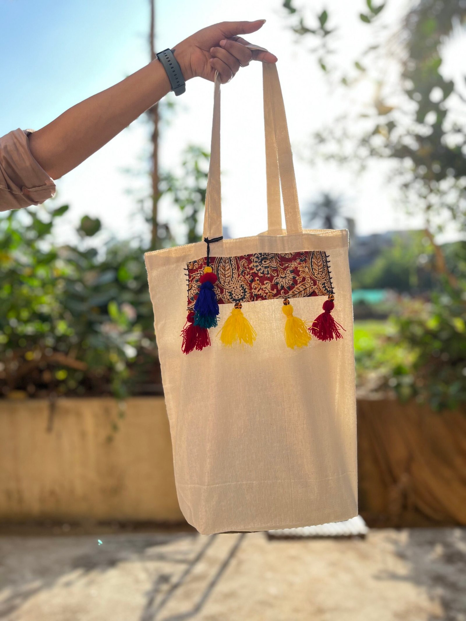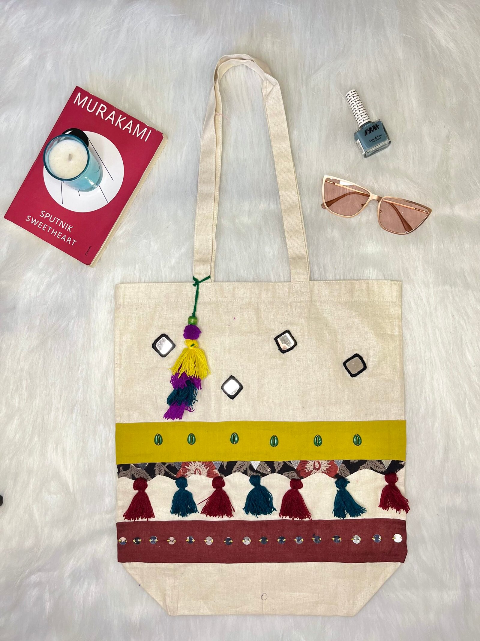 This handcrafted canvas tote bag is a beautiful blend of fabric patches, tassels, and mirror work, adding a vibrant touch of ethnicity to your style. Perfect for both traditional and casual outfits, it effortlessly elevates any look. Make a statement with this versatile and eye-catching handbag, designed to bring both charm and cultural flair to your wardrobe.