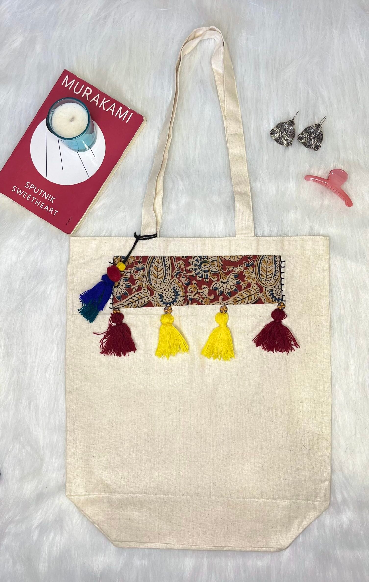 Add a touch of tradition to your everyday style with our Kalamkari Canvas Tote Bag. Crafted from durable canvas, this tote features a beautifully hand-stitched Kalamkari patch, delicate embroidery details, and playful tassels for a boho-chic finish. Spacious and versatile, it’s perfect for work, travel, or casual outings.